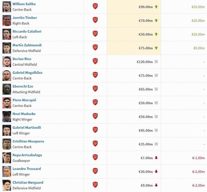 阿森纳球员身价变动:萨利巴上涨1000万欧,萨卡下跌1000万欧
